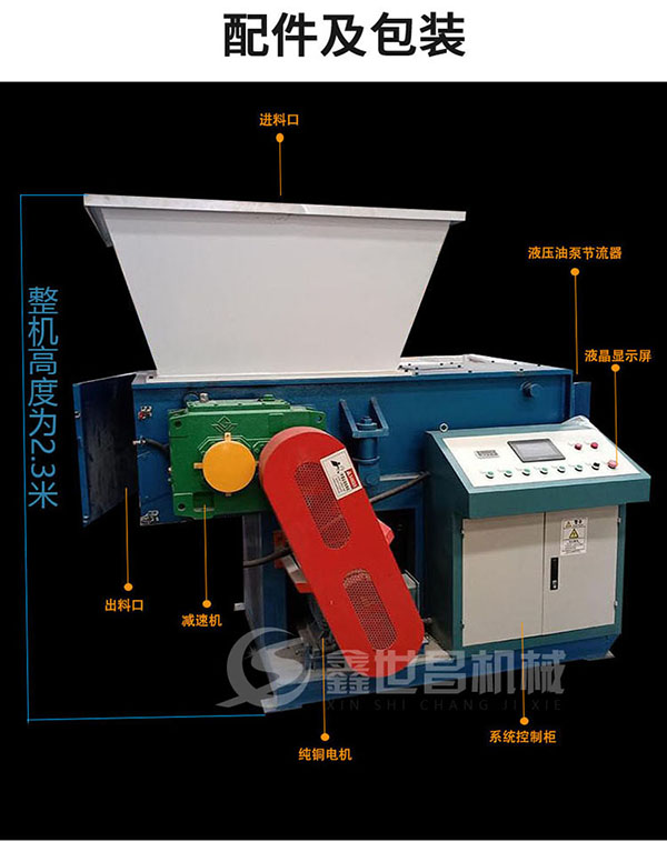 機頭料撕碎機單軸撕碎機主要由刀片主軸、定刀、承載箱體、箱體支架、進料系統、液壓推料系統、動力系統、電器控制系統組成的機器,機頭料撕碎機型號從600,800,1000,1200均有現貨。
